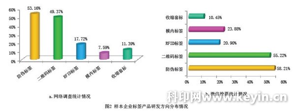 工藝技術創新在產品上的體現,則主要集中于防偽標簽、溯源和物流追溯標簽、個性化促銷標簽等產品領域。網絡調查反饋情況是:53.16%的樣本企業將主要研發方向定位于防偽標簽,49.37%的樣本企業將可變信息二維碼標簽作為主要研發方向,17.72%的樣本企業將研發RFID標簽作為2016年的重點,7.59%的樣本企業在開發模內標簽,11.39%的樣本企業則在收縮套標領域深耕,見2-a。而微信投票的統計結果則如2-b所示,其中研發模內標簽的占比較之網絡調查結果更突出。