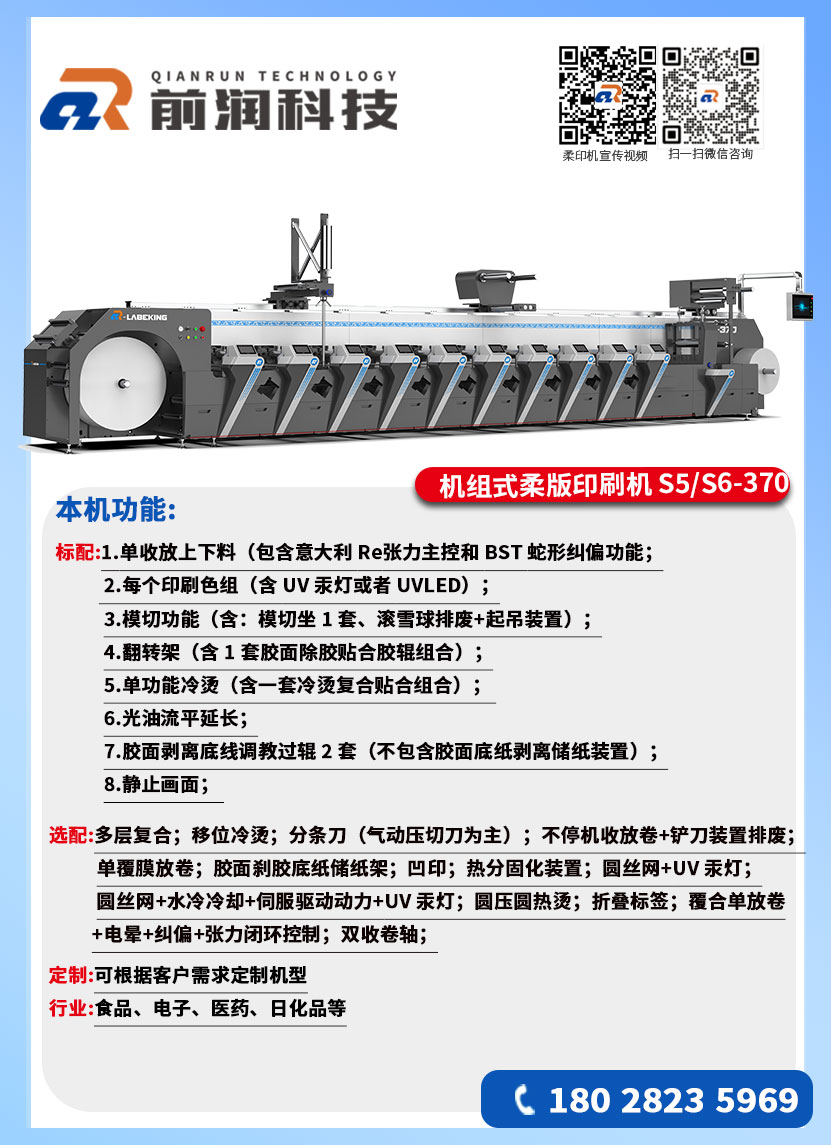5、多功能印刷:柔版印刷為主,支持冷燙、覆膜、除膠、多層標簽、折頁標簽、在線品檢、模切等工藝,可選配絲印、噴碼、凹版等聯機功能。