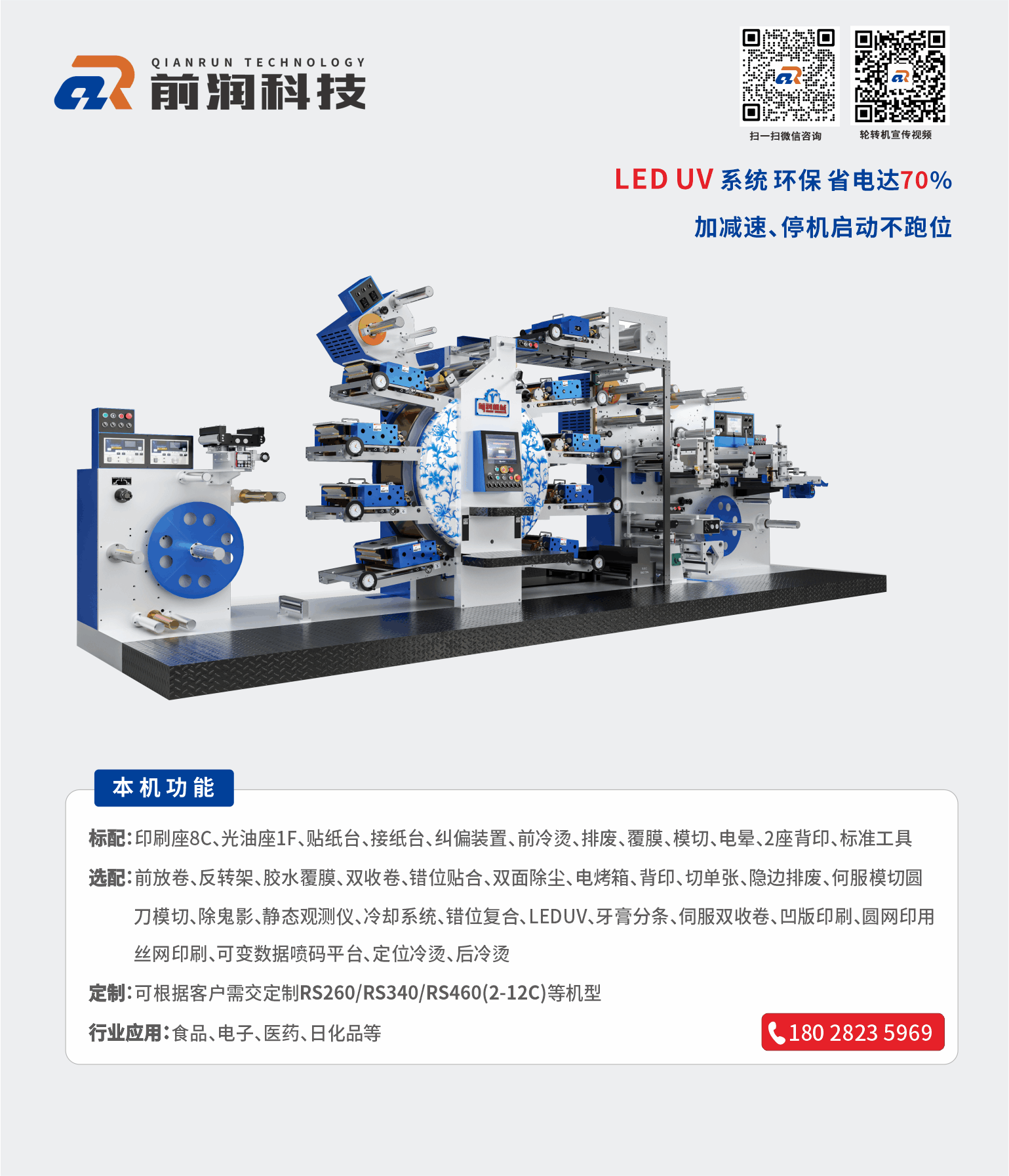 主營設備商標印刷機、衛星式輪轉印刷機、模切機 等產品,公司可為客戶量身制定商標機、輪轉機等自動化解決方案。公司有強大的研發體系,確保能為客戶量身定制各類非標且最有價值的產品;前潤機械在國內外擁有極高的市場占有率及良好的信譽,贏得了眾多知名企業的青睞與合作,產品暢銷多個國家和地區,市場銷量近萬臺;我們愿與您攜手合作,建立長久雙贏機制,共享成功喜悅!加盟熱線:133 2260 8282