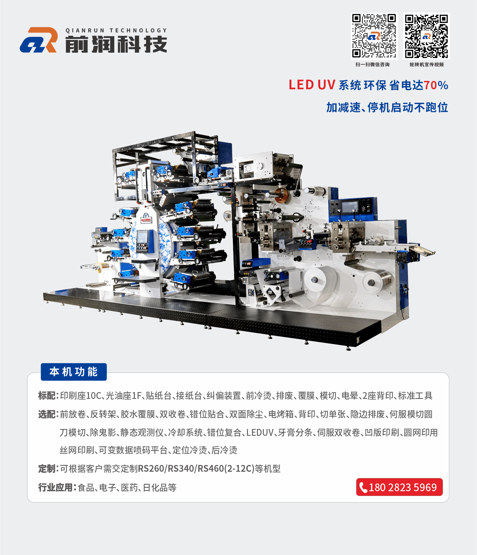 主營設備商標印刷機衛星式輪轉印刷機模切機 等產品,公司可為客戶量身制定商標機、輪轉機等自動化解決方案。公司有強大的研發體系,確保能為客戶量身定制各類非標且最有價值的產品;前潤機械在國內外擁有極高的市場占有率及良好的信譽,贏得了眾多知名企業的青睞與合作,產品暢銷多個國家和地區,市場銷量近萬臺;我們愿與您攜手合作,建立長久雙贏機制,共享成功喜悅!加盟熱線:133 2260 8282